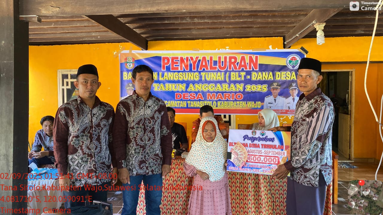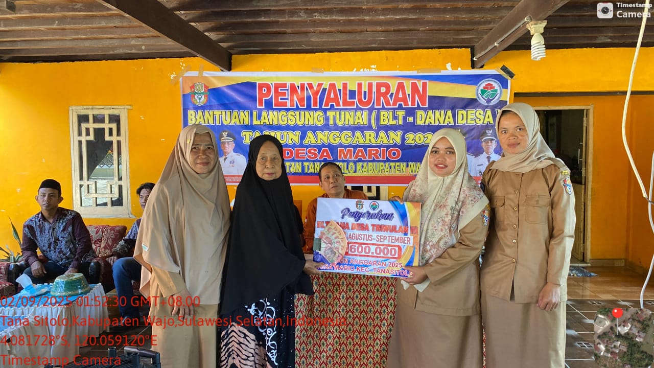 MARIO - pada ( 02/09/2025) Pemerintah Desa Mario Kecamatan Tanasitolo kembali menyalurkan Bantuan Langsung Tunai Dana Desa (BLT) untuk bulan Agustus dan September 2025. Kegiatan penyaluran berlangsung di kantor desa Mario dan dihadiri langsung oleh Camat Tanasitolo yang diwakili TA P3MD, Kepala Desa yang diwakili Sekertaris Desa beserta perangkat desa, BPD, serta perwakilan masyarakat penerima manfaat.