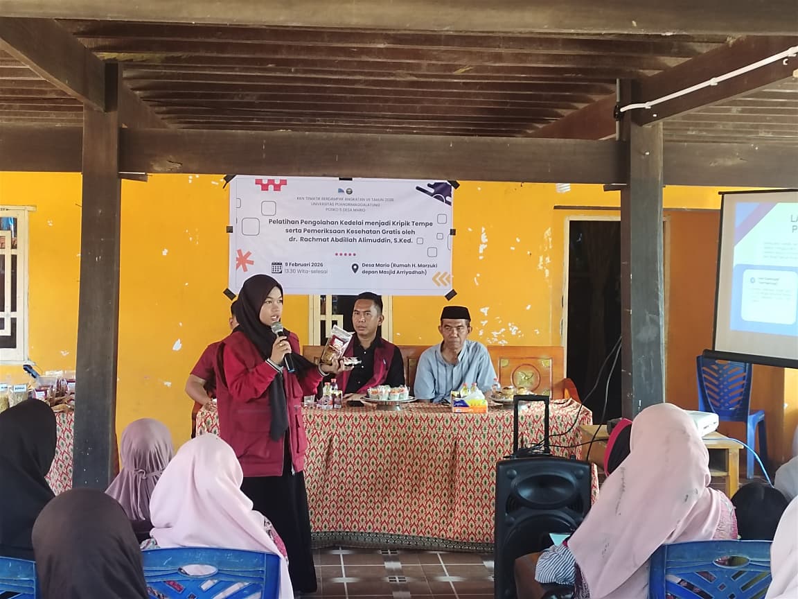MARIO - pada (09/02/2026) Mahasiswa Universitas Prima Sengkang Angkatan VII Posko 5 Desa Mario melaksanakan kegiatan Pelatihan Pengolahan Kedelai Menjadi Keripik Tempe yang merupakan salah satu program unggulan Kuliah Kerja Nyata (KKN), dirangkaikan dengan pemeriksaan kesehatan gratis bagi masyarakat. Kegiatan ini dilaksanakan di Desa Mario dan mendapat antusiasme tinggi dari warga setempat.